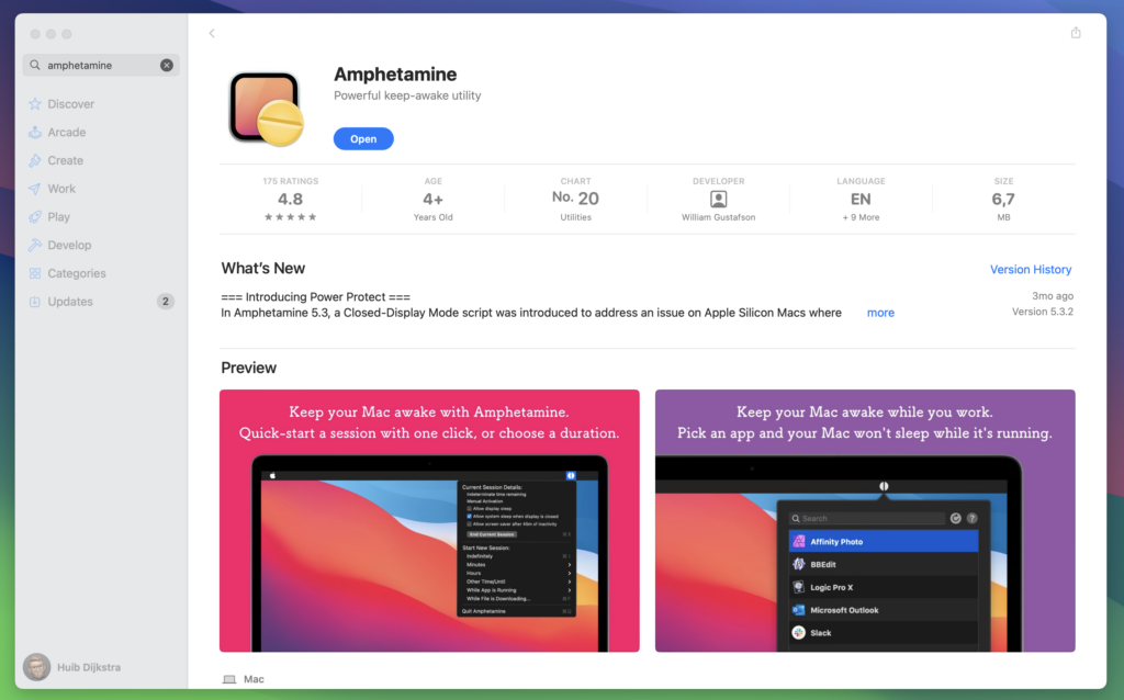 Amphetamine is a macOS application that helps users keep their Mac awake and prevent it from going to sleep. It’s particularly useful in situations where you want to ensure that your Mac remains active, such as during presentations, watching videos, or performing long-running tasks. Amphetamine offers various customization options and features to tailor the behavior according to the user’s preferences, including schedules for when to activate or deactivate the app, and notifications to alert the user when the Mac is about to sleep