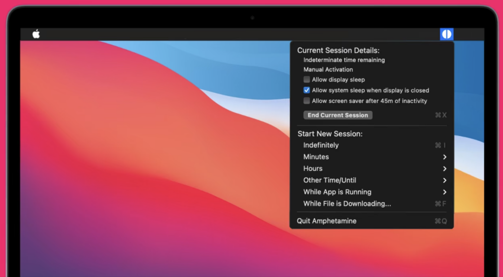 After launching, locate the ‘Pill’ icon situated in the top menu bar of MacOS, which is referred to as the status menu. Within this section, you’ll find various settings to manage your Mac’s ‘awake period’. If you wish to assume full control, simply click the ‘indefinitely’ button and proceed with your work.